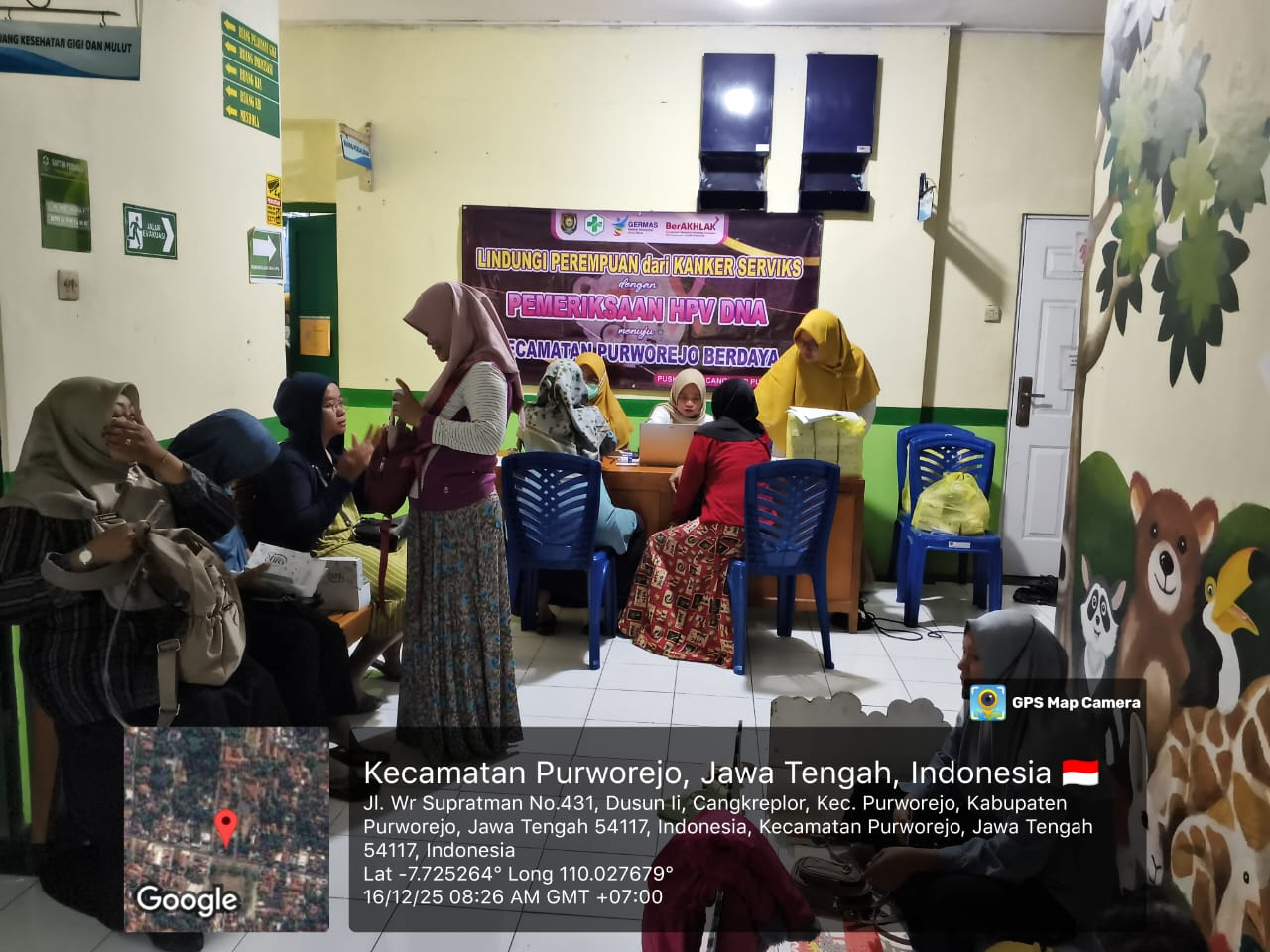Telah dilaksanakan kegiatan pemeriksaan HPV DNA di wilayah kerja Puskesmas Cangkrep, Kabupaten Purworejo. Kegiatan ini berlangsung selama dua hari, yaitu pada hari pertama tanggal 16 Desember 2025 di Puskesmas Cangkrep Purworejo dan hari kedua tanggal 17 Desember 2025 di Kelurahan Cangkreplor, Purworejo. Kegiatan pemeriksaan HPV DNA ini dihadiri oleh Camat Purworejo serta perwakilan dari Dinas Kesehatan Daerah Kabupaten Purworejo, sebagai bentuk dukungan terhadap upaya deteksi dini kanker leher rahim pada masyarakat.